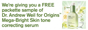 Hurry over to the Origins Facebook Page and you can request a FREE packette sample of Dr Andrew Weil for Origins Mega-Bright Skin Tone correcting serum.