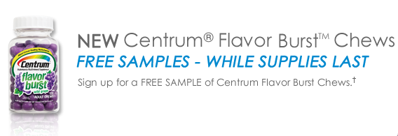 FREE Sample of Centrum Flavor Burst ChewsAugust 31, 2012 by Wheel 'n Deal Mama Leave a CommentTweetPinShare0 SharesHurry over here and you can request a FREE sample of Centrum Flavor Burst Chews!While supplies last, so snag your’s now! (Thanks Coupon Pro)TweetPinShare0 Shares