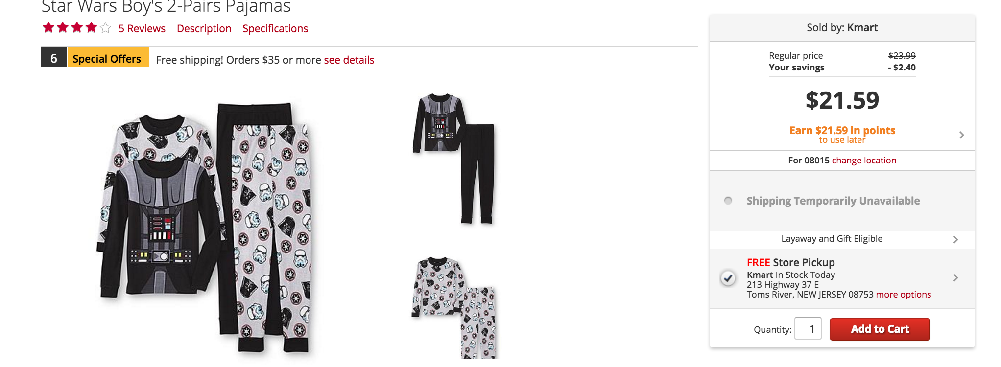 Right now the 2 pack of Star Wars Pjs is on sale for $21.59 and you will get $21.59 back in Shop Your Way Points making them FREE! You will see the points in your account almost immediately after purchasing 🙂