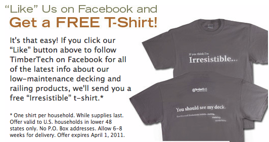 Free TimberTech "Irresistible" T-ShirtFebruary 21, 2011 by Wheel 'n Deal Mama Leave a CommentTweetPinShare0 SharesHead over to the TimberTech Facebook Page and you can request a FREE T-shirt!One per household, while supplies last. TweetPinShare0 Shares