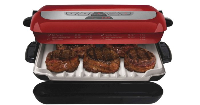 This 4-in-1 grill has ceramic grill plates for traditional grilling or to use as a panini press. Swap out the grill plates for the deep dish bake pan or the muffin insert! Each plate is completely removable for cleaning and dishwasher-safe.