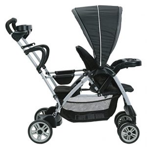 Ideal for walking and running errands with two children, this stroller offers front and rear seats that each hold a child up to 50 pounds. The front seat features a multi-position recline and can even be placed in a fully flat position for naptime. Your older child can also opt to stand on the sturdy platform. This stroller also includes a parent tray with two deep cup holders and extra storage space for keys, a wallet or phone.