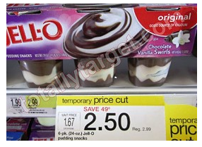 Go to Coupons.com and use the zip code 33712 as needed to print this coupon for $1.10 off any ONE refrigerated Jell-o Snacks! Target has these on a temporary price cut at $2.50, use this $1.10/1 coupon and you will only be spending $1.40 for a 6-pack!