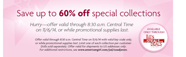 Today there is a HOT American Girl Sale from Jill’s Deals and Steals!! There are TONS of HOT American girl items on sale but they will sell out fast so be quick! Just head on over here and use coupon code TODAYNOV