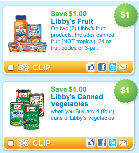 Here are another couple HOT coupons that you will want to print NOW! The $1/2 Libby’s Fruit and $1/4 Libby’s Veggies coupons are back!