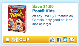$1.00 off off any TWO (2) Post Kids Cereals- 11oz+ only
