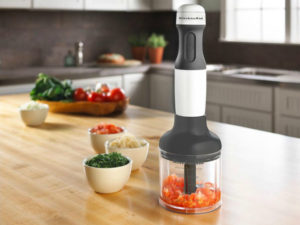 This hand blender features a removable 8″ blending arm with a stainless steel S-shaped fixed blade. It also has a soft grip handle which provides a comfortable grip when blending your ingredients. It comes with a whisk attachment, a 2-1/2 cup chopper attachment with lid locks, and a 3-cup BPA-free blending jar.