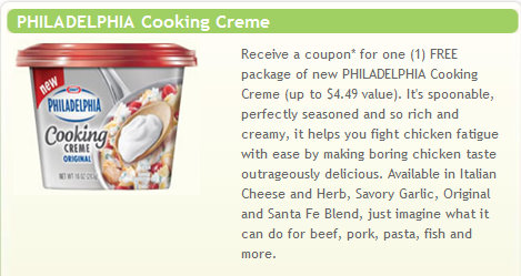 Some will have a coupon for a FREE container of the new Philadelphia Cooking Creme and some will be able to print a $1.50 off coupon (which combined with the Target Printable should make for a VERY inexpensive container).