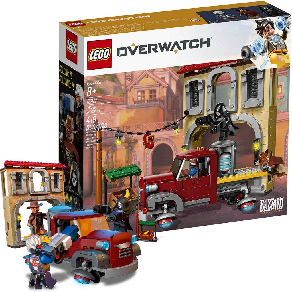 This building set includes three Overwatch LEGO minifigures, three character weapons, a buildable Dorado-style scene and Payload truck, with a total of 419 pieces.