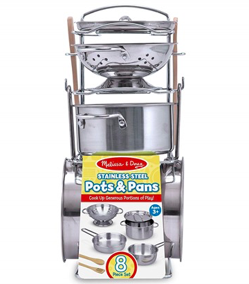 This pretend 8-piece kitchen set includes pots and pans, a storage rack and two wooden utensils. The durable pots and pans are made of thick stainless steel making them look just like real pots and pans.
