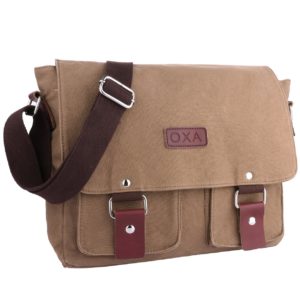 Each messenger bag is made of thick and durable canvas and designed to fit 14″ laptops. There are seven pockets for organization and the shoulder strap is adjustable for comfort.
