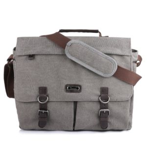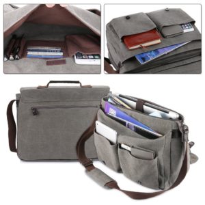 This messenger bag is made of thick and durable canvas with eight pockets for organization, including compartments designed to fit 15.6″ laptops and iPads. Plus, the shoulder strap is adjustable and padded for comfort.