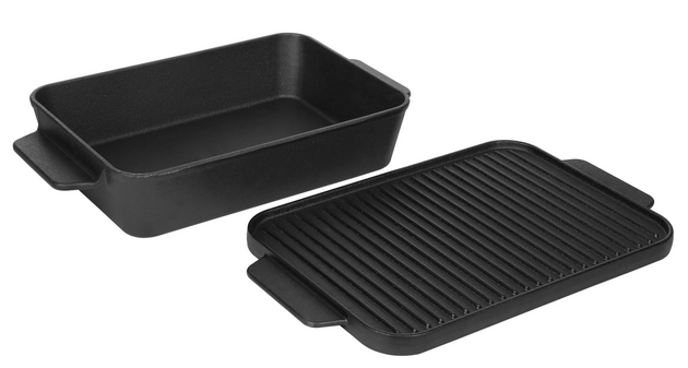 This durable, cast-iron deep pan measures 16 x 9.6 x 3.5 and comes with a reversible lid that also functions as a griddle – it gives you the option of a flat or ribbed surface when cooking!