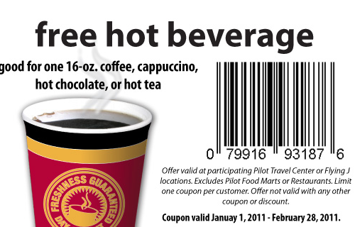 Head over to the Pilot Travel Center Facebook page and you can print a coupon for a FREE cup of coffee! Good for one 16-oz coffee, cappuccino, hot chocolate or hot tea!