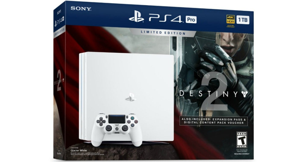 This PlayStation 4 Pro Bundle includes a PlayStation 4 Pro in Glacier White, a DualShock 4 wireless controller, and Destiny 2 video game. It also includes an expansion pass and a digital content pack voucher with bonus Destiny 2 content and more!