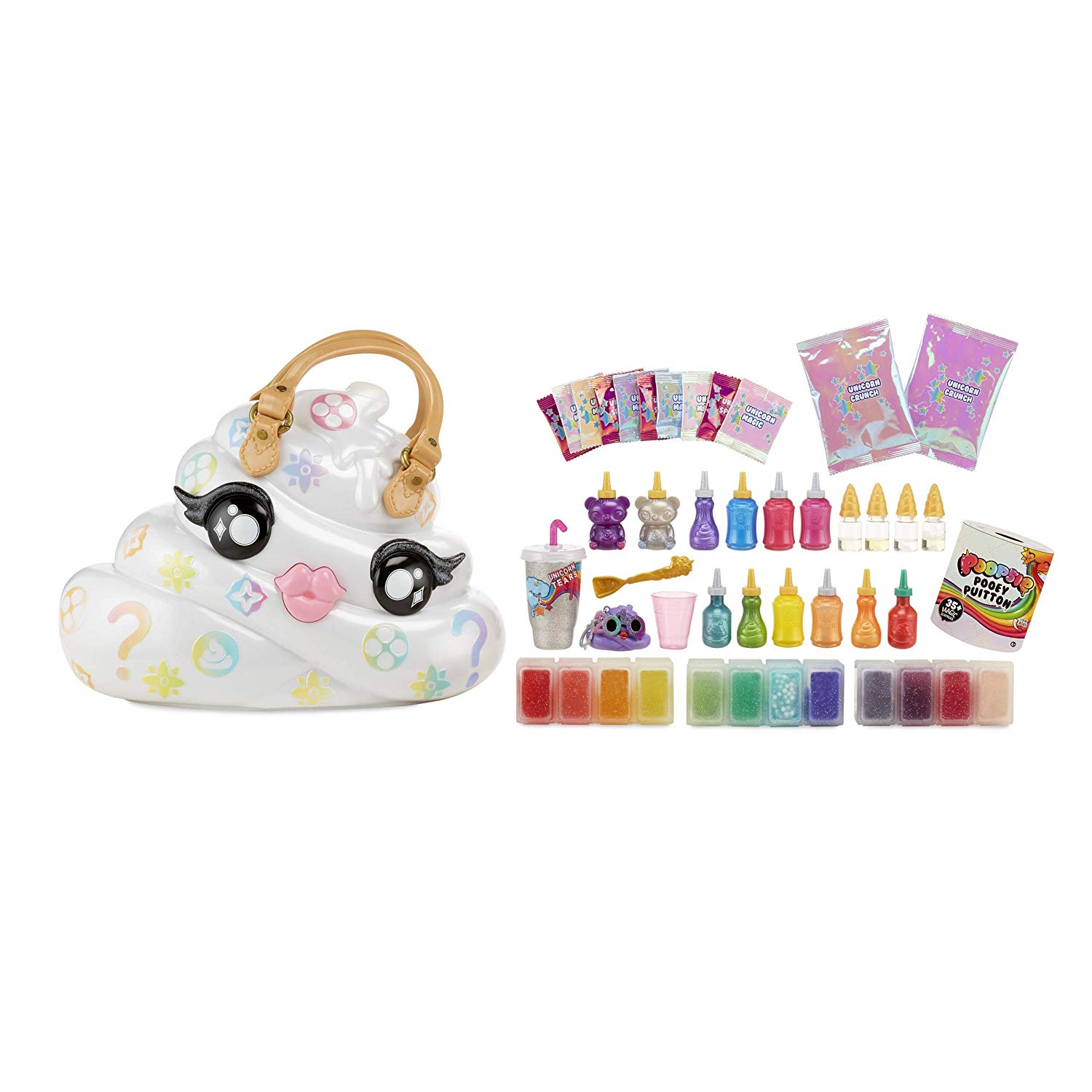 This slime surprise toy is a lot like the LOL Surprise Big Surprise Balls from last year in that it has over 35 magical surprises. It includes 12 Unicorn Food Bottles (slime powder), packets of magic, sparkle, and crunch as well as mystery scents. Plus, it’s packed in a Pooey Puitton purse!