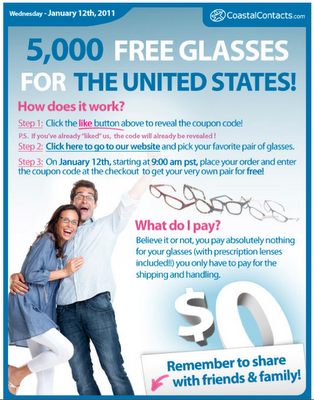 Coastalcontacts.com is giving away 5000 pairs of prescription glasses tomorrow morning at 9am PST.