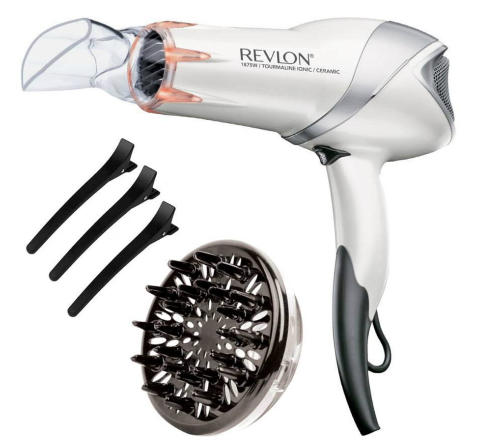 This hair dryer features infrared heat to provide shine, softness and control, and tourmaline ionic technology that reduces frizz. It has two heat/speed settings and a cool shot button, plus it includes three hair clips, a concentrator and a diffuser attachment.