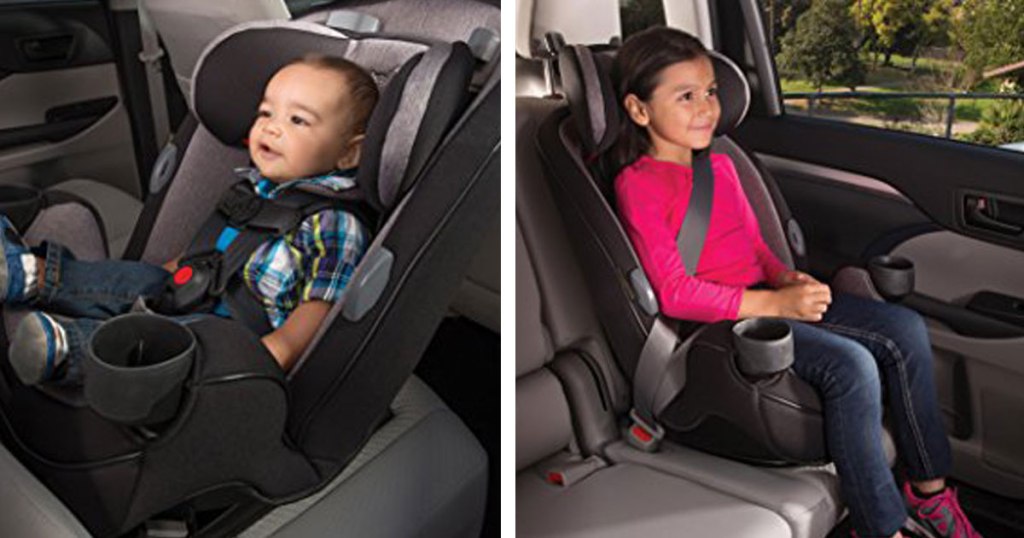 This convertible car seat works as rear-facing for 5-40 pounds, forward-facing for 22-65 pounds, and as a belt-positioning car seat once your kiddo reaches 40 pounds!