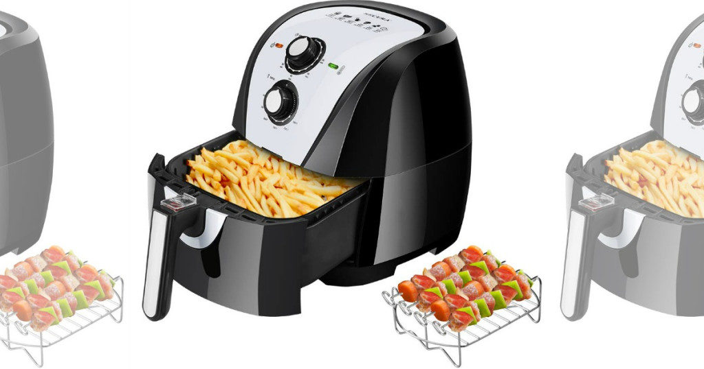 This large capacity air fryer is available in 5 colors at this low price. It has a smudge-free exterior and features convection technology which seals in flavor and moisture without the need for fat or grease. It’s rapidly circulating hot air technology can fry, roast, grill, reheat and bake, and the included metal basket is dishwasher-safe for easy clean-up. It also includes a grill rack, skewers, and specialty air fryer recipes.
