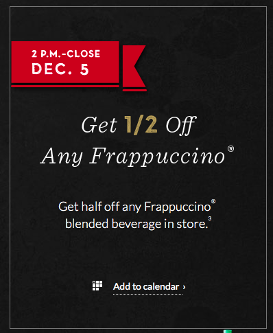 Starbucks Merry Mondays! 1/2 OFF any Frappuccino 2-5 TODAY ONLYDecember 5, 2016 by Jennie Leave a CommentTweetPinShare0 SharesToday only, from 2PM-Close, Starbucks Rewards Members can grab 1/2 OFF any Frappuccino Blended Beverage..TweetPinShare0 Shares
