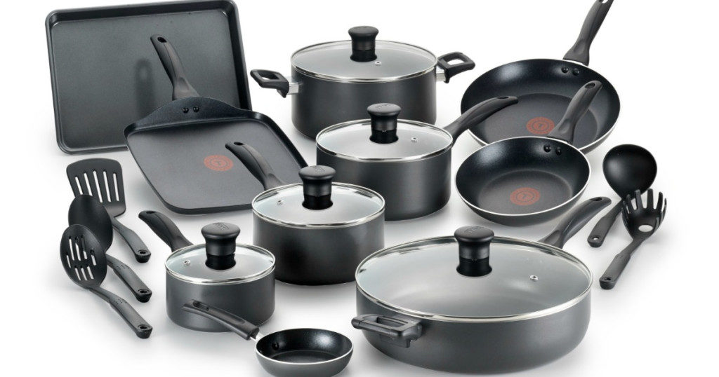 This T-fal 20-Piece Cookware Set includes an 8″ fry pan, 10.5″ fry pan, 10.25″ square griddle, 5qt covered jumbo cooker, 5qt covered dutch oven, 1qt covered saucepan, 2qt covered saucepan, 3qt covered saucepan, 9″ x 12.5″ cookie sheet and 5 nylon cooking utensils. The pots and pans are non-stick and dishwasher safe.