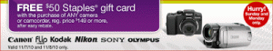 Today and tomorrow only, if you purchase ANY camera or camcorder ($149+) you will get a $50 Staples Gift Card with an easy rebate. This is another great camera deal if you are on the hunt for a new one. A few good ones that I recommend right in the $149 price range:Flip Video Ultra 120 minute digital camcorderCanon PowerShot A3100 IS Digital … [Read more...]