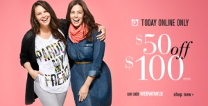 Lane Bryant: $50 off a $100 Purchase!! Today Only!