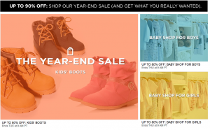 Yup another one!!! Hurry over to MyHabit (click the picture above if you haven't signed up yet) and you can shop their CRAZY Year End sale!! They have Boots, Clothes and so much more --- all up to 90% off top end brands!!! They have kids, women and men year end sales --- so check them all out!!! If you are already signed up with MyHabit -- then … [Read more...]