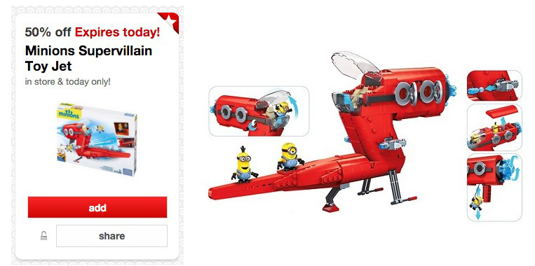 Target: Minions Supervillain Toy Jet Only $17.50 (Today Only)November 30, 2015 by Jennie Leave a CommentTweetPinShare0 SharesMinions Supervillain Toy Jet $34.99 Use the 50% off Minions Supervillain Toy Jet Cartwheel Offer = $17.50!TweetPinShare0 Shares
