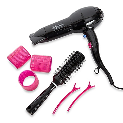 This hair dryer set includes a TRESemmé 1875 watt hair dryer, medium round brush, concentrator attachment, 3 velcro rollers and 2 sectioning clips!
