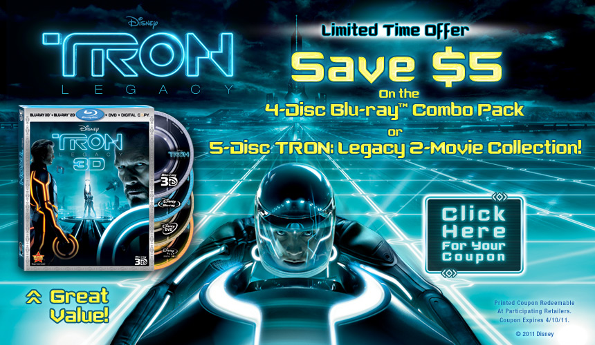 Head over here and you can print out a $5 off the new Tron Legacy Disney Movie that is being released on Tuesday, April 4.