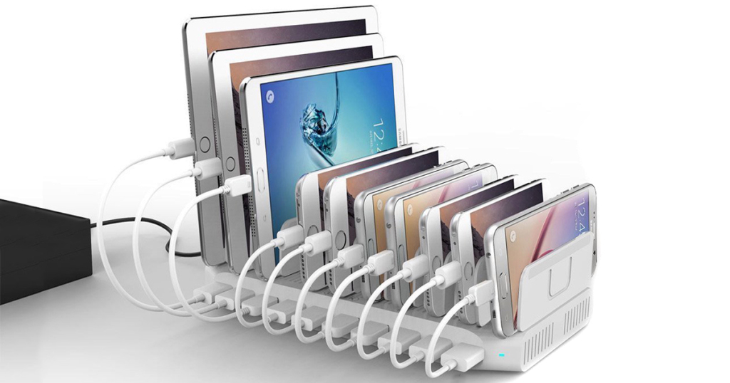 This charging station charges up to ten devices simultaneously by using only one wall outlet. Simply connect all your smartphones, tablets, cameras, speakers, headsets and more and quickly charge all of them at your home or office. The detachable dividers allow you to adjust width so you can accommodate a variety of devices.