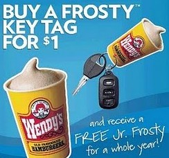 So I guess there is an offer at Wendy’s right now where if you buy a frosty key chain for $1 you can get FREE Jr. Frostys for a YEAR! With any purchase.