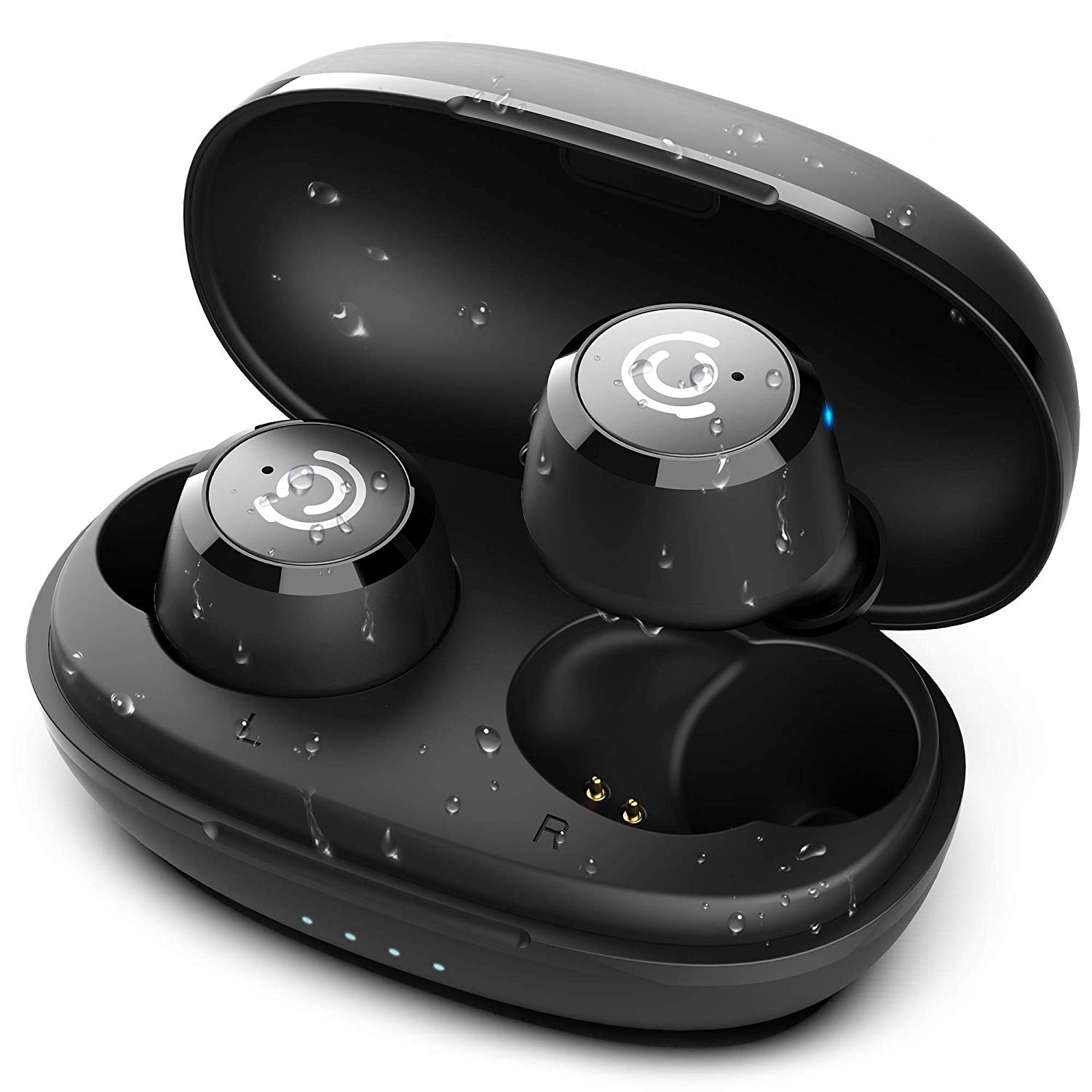These wireless earbuds deliver high HD sound quality and are water-resistant. They feature one-step pairing technology, so you can simply take both earbuds from the charging case and they will pair with each other. The portable charging case also acts as a universal power bank for the earbuds.