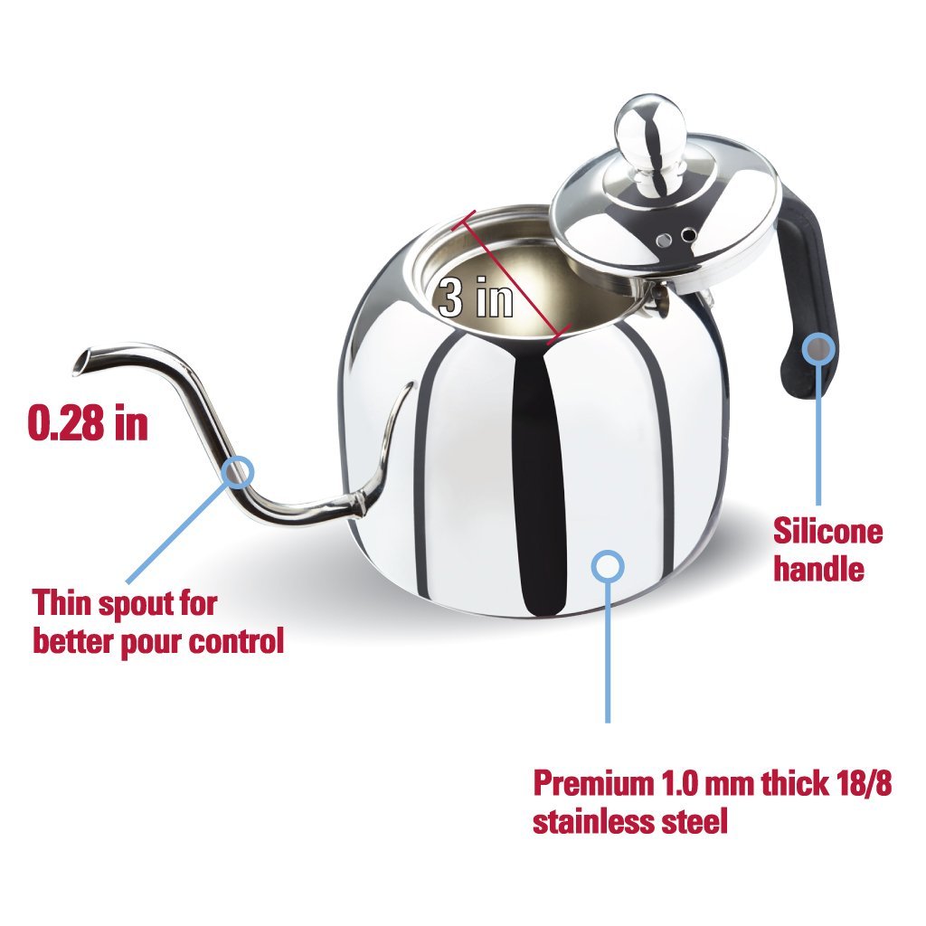 This BPA-free stainless steel kettle allows you to pour out liquids without creating drips and messes. Plus, it won’t rust, corrode, or affect the flavor of your drinks in any way. It also features an angled stay-cool handle to keep your hands away from the heated pot, and it’s safe for use on all stoves.